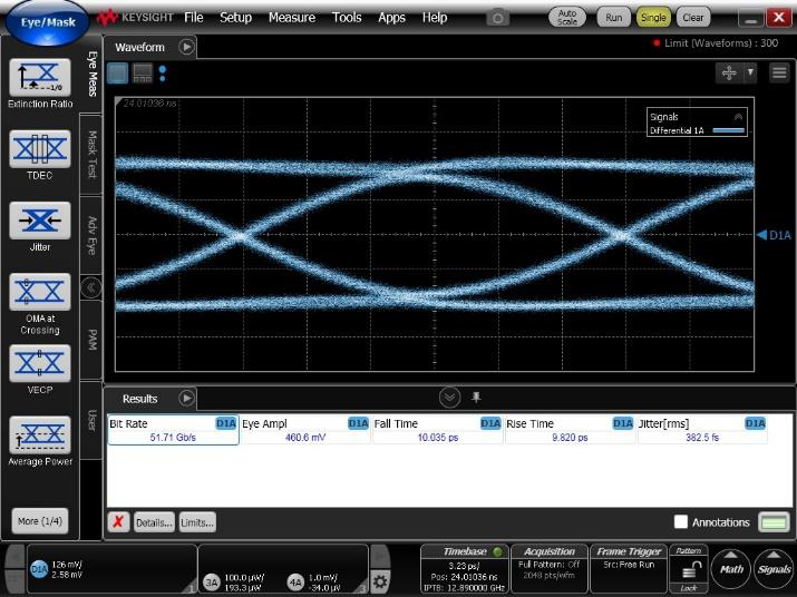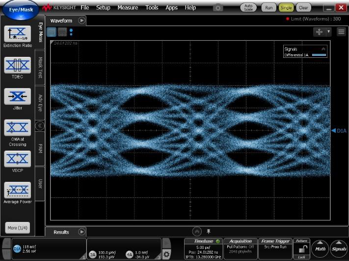 VIT8X00包括發(fā)射機均衡(7Tap FFE)和類似TH5的接收機均衡,可以提供測量信噪比(SNR)、眼高測量、鏈路建立時間、BER測量和FEC測量。
