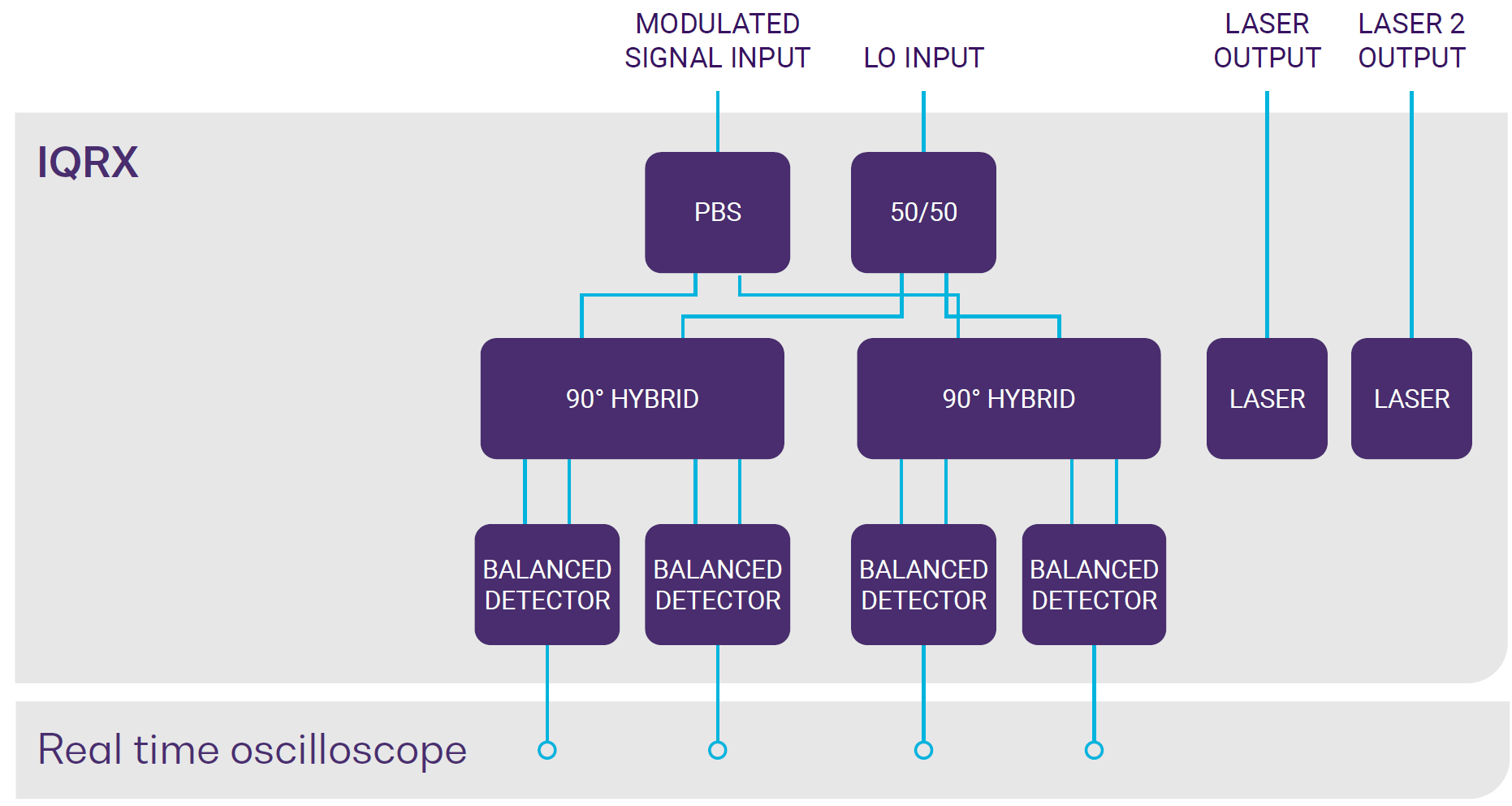 IQRX 采用頂級分立光纖器件設(shè)計制造,可高保真度測量相干調(diào)制信號。為最大限度降低噪聲,IQRX 未使用商業(yè) ICR 中常見的跨阻放大器(TIA)。