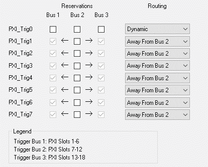 每個槽位都可以創(chuàng)建觸發(fā)信號,并且觸發(fā)事件可以通過每個PXI觸發(fā)線傳輸。通過NI MAX軟件界面為PXIe機箱配置觸發(fā)線非常簡單。