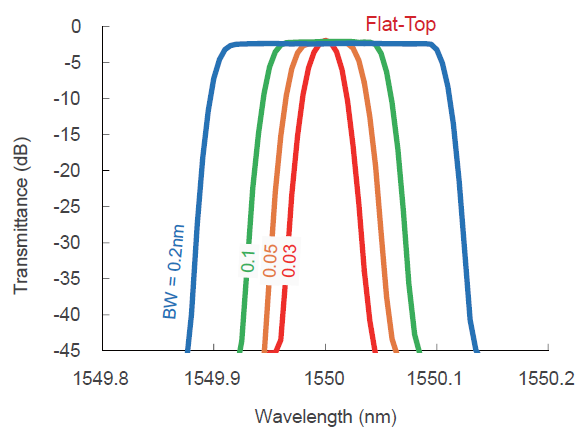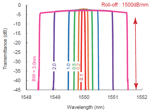3dB帶寬在其最窄處是30pm(3.7GHz),可持續(xù)調(diào)節(jié)到3nm(370GHz)。