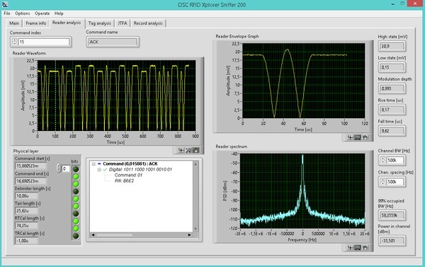 CISC RFID Xplorer讀寫器測(cè)試儀是基于可配置的標(biāo)簽仿真器,標(biāo)簽仿真器可通過變化的反向散射強(qiáng)度測(cè)量讀寫器的發(fā)射功率和讀寫器接收靈敏度。同時(shí),標(biāo)簽仿真器可測(cè)試基于時(shí)序變化的讀寫器行為如BLF(反向頻率)容限。